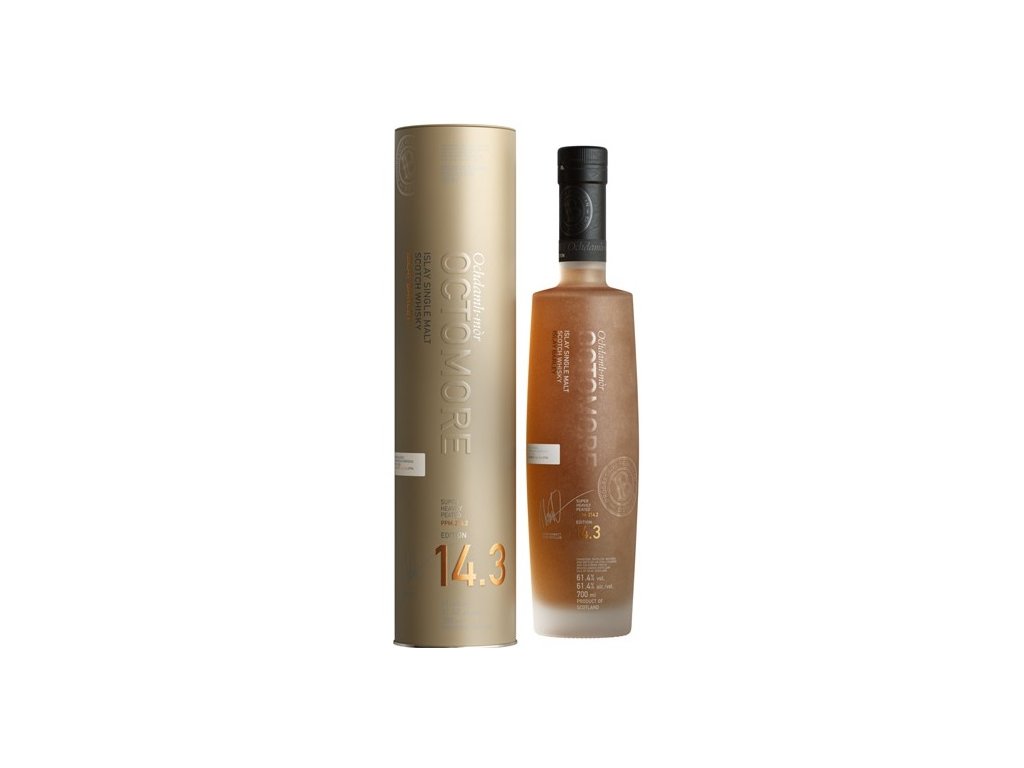 Octomore 14.3 zraje v sudech po americké whisky a v sudech z evropského dubu. Octomour 14.3 je whisky, která byla destilována ze 100% skotského ječmene Concerto s obsahem rašeliny 214,2 ppm. Vyniká komplexní chutí, která kombinuje super těžké rašeliny a ječmene z ostrova Islay. Ve vůni najdete jedinéčné tóny sušenek, sladu a rašeliny. Nejlépe si ji vychutnáte čistou, na ledu nebo v prémiovém koktejlu.