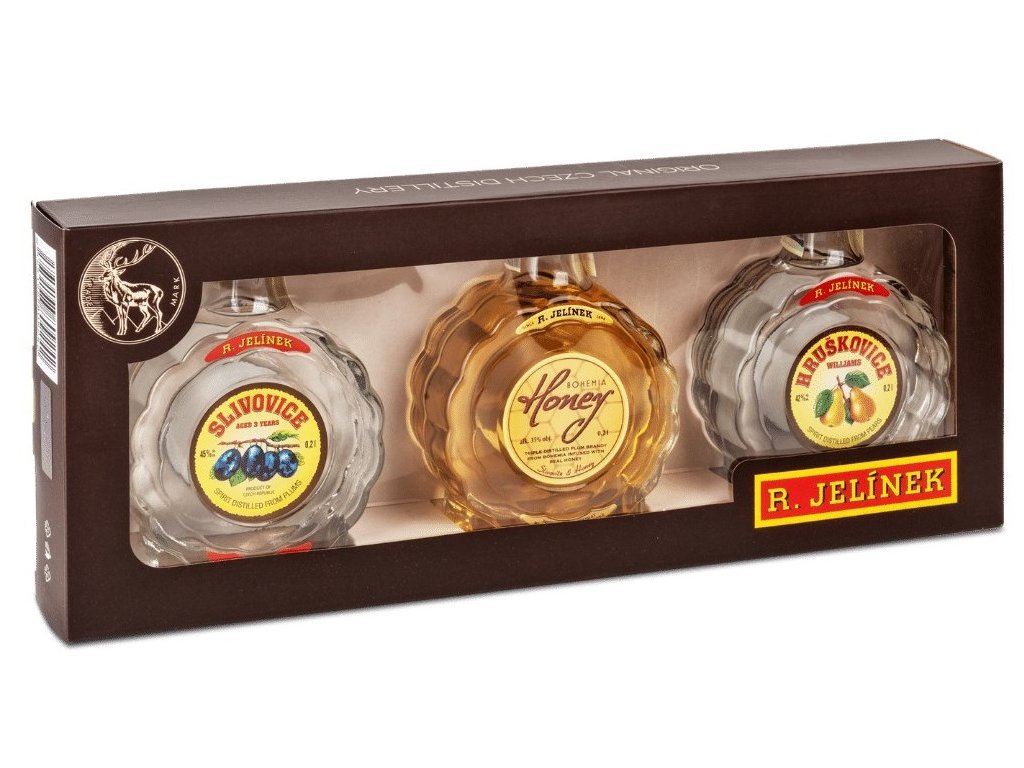 Dárkové balení R. JELÍNEK obsahuje tři lahve ovocných destilátů o objemu 0,2 l. Jmenovitě Slivovici 45%, Hruškovici 42% a Bohemia Honey 35%.Doplňkové parametry