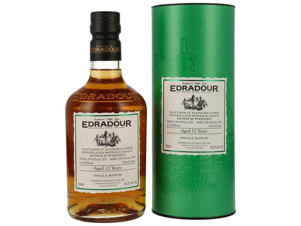 Edradour 12 Year Old Madeira Casks 48,2 % je limitovaná edice Highland single malt skotské whisky, proslulá svým bohatým, kořenitým a ovocným profilem, který je výsledkem výhradního zrání v sudech typu first-fill hogshead po víně Madeira.