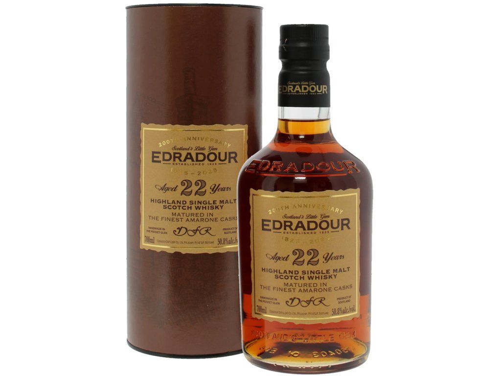 Whisky Edradour 22 Year Old s obsahem alkoholu 50,8 % je limitovaná edice zrající v sudech po Amarone víně, vydaná k 200. výročí palírny.