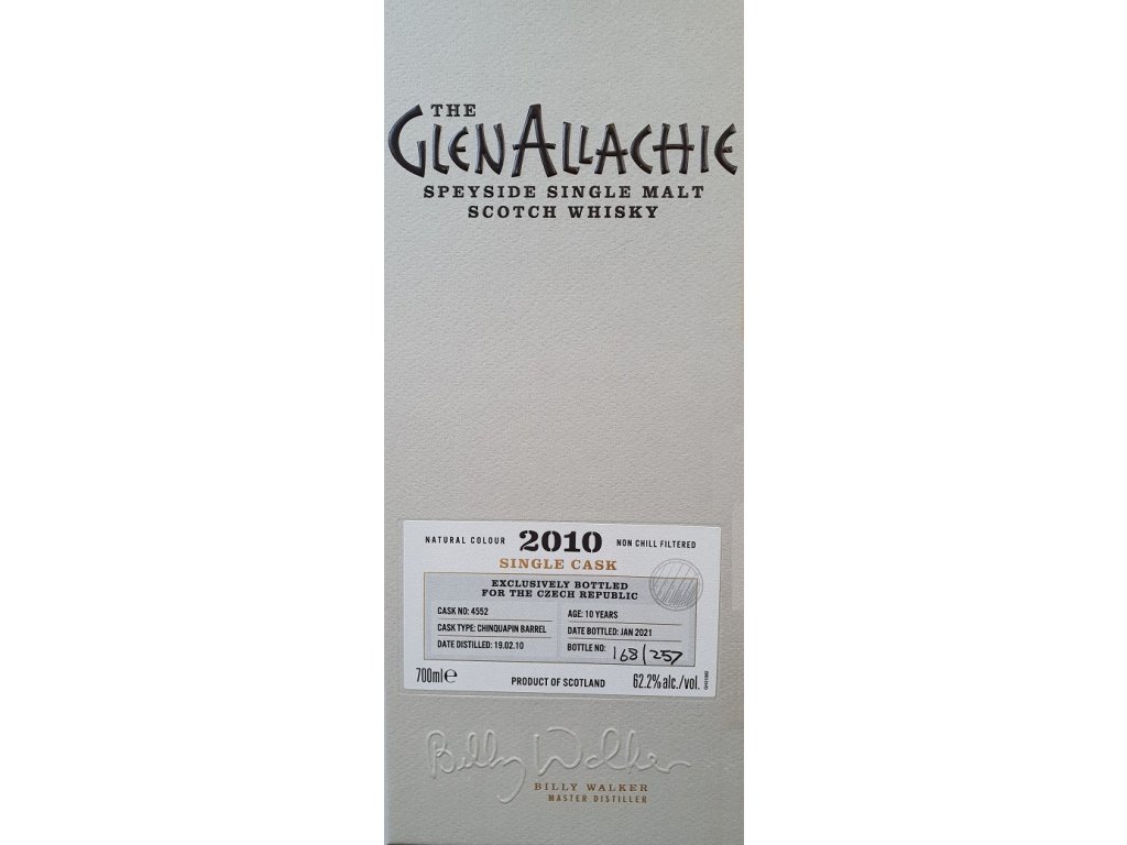 Ručně vybrané sudy Master Distillerem Billym Walkerem, The GlenAllachie 10yo Chinquapin Barrel je součástí exkluzivní série Single Cask. Každá speciálně vybraná verze demonstruje výjimečné sudy, které se nacházejí ve skladech GlenAllachie.