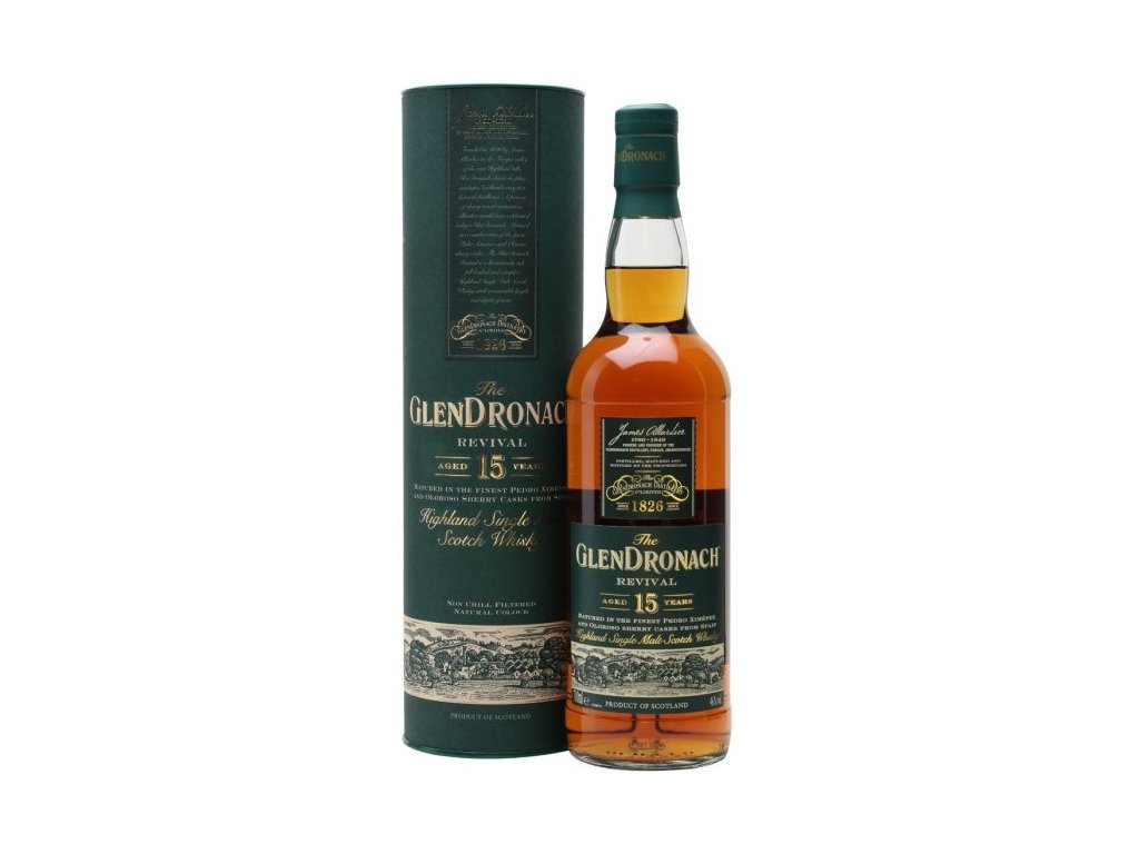 15letá The GlenDronach Revival je zpět! Poté, co byla její výroba v roce 2015 z důvodu nedostatku zásob v sudech pozastavena, byly sudy opět naplněny. Podle tradiční receptury zraje v sudech po sherry Pedro Ximenéz a Oloroso.