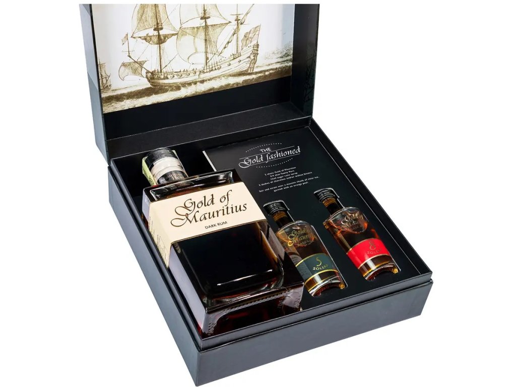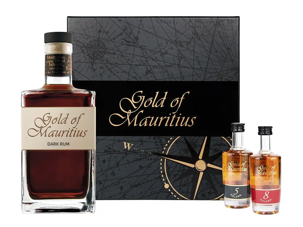 Dárkové balení obsahuje navíc dvě miniatury (2 x 0,05 l) starších rumů značky Gold of Mauritius - Solera 5 a Solera 8.