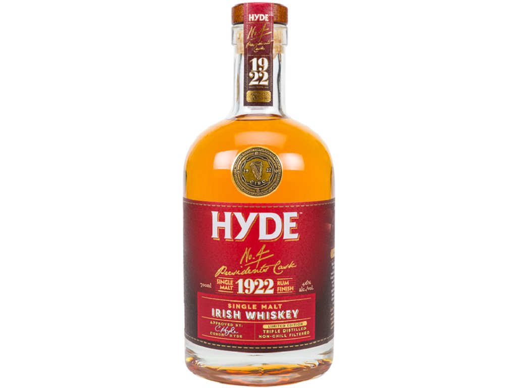 Irská Single Malt whiskey Hyde NO.4 je vyrobena ze 100 % sladového irského ječmene. Tato whiskey je třikrát destilována v malých dávkách tradiční kotlíkovou metodou. Zraje v sudech po výběrovém bourbonu po dobu 6 let a následně dozrává 6 měsíců v sudech po tmavém karibském rumu z Barbadosu, který výsledné whiskey předává úžasné kořeněné tóny s nezaměnitelným aroma a chutí. Rok 1922 uvedený na etiketě označuje vznik Irského svobodného státu.