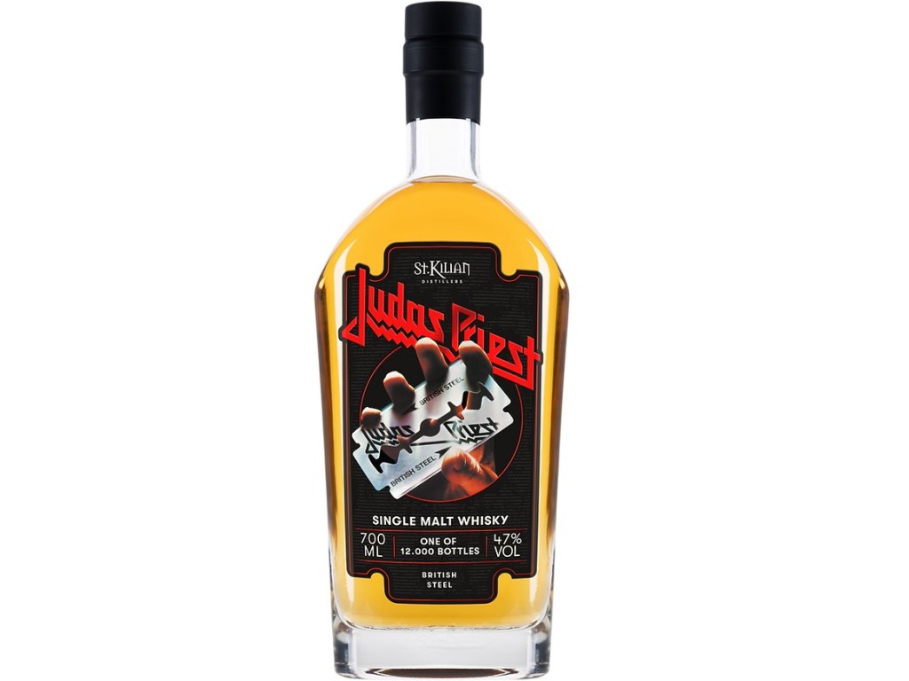 Judas Priest British Steel Whisky je exkluzivní limitovaná edice whisky inspirovaná ikonickým albem British Steel od legendární heavy metalové kapely Judas Priest. Tento jedinečný destilát vyrábí renomovaná St. Kilian Distillers v Německu, známá svým mistrovským přístupem k výrobě whisky podle skotských tradic.