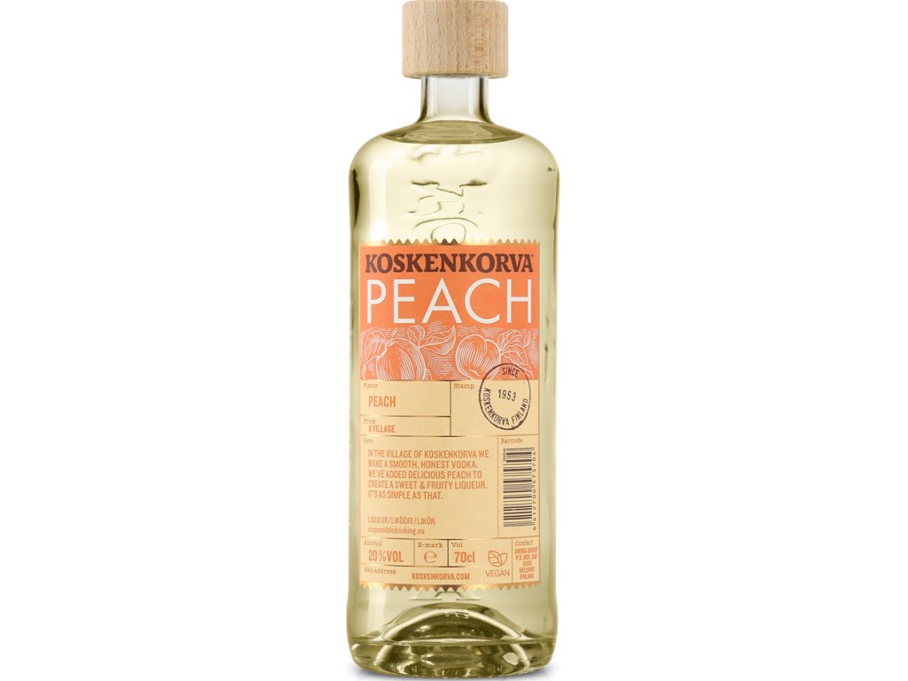Značka Koskenkorva je známá především svou čirou a jemnou vodkou. V současnosti vyrábí i jiné skvosty, mezi které patří i ochucená vodka Koskenkorva Peach. Patří mezi nejprodávanější a nejznámější produkty značky Koskenkorva, a to díky své příjemné broskvové chuti. Láhev je opatřena praktickým uzávěrem. Koskenkorva Peach obsahuje 21 % alkoholu.