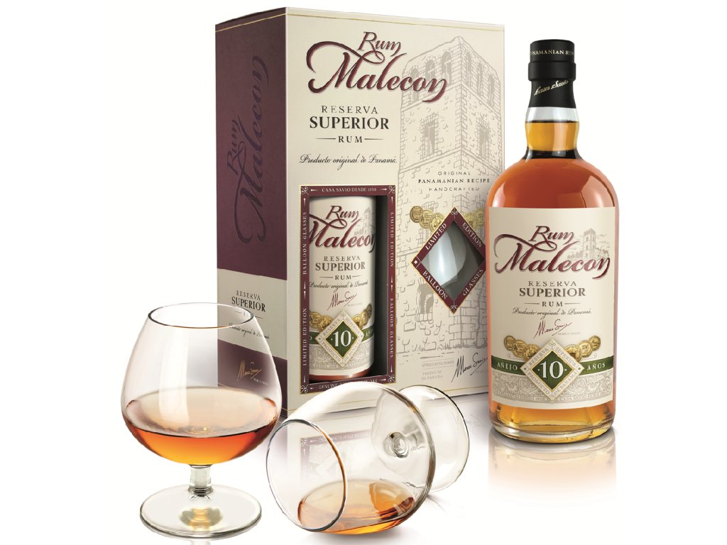 Malecon Reserva Superior 10 Y. O. Glass set je dodáván v krásném dárkovém balení se dvěma skleničkami.