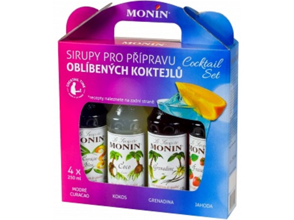Sada sirupů pro přípravu oblíbených koktejlů. Balení obsahuje Monin Blue curacao, Monin kokos, Monin grenadina a Monin jahoda.Doplňkové parametry