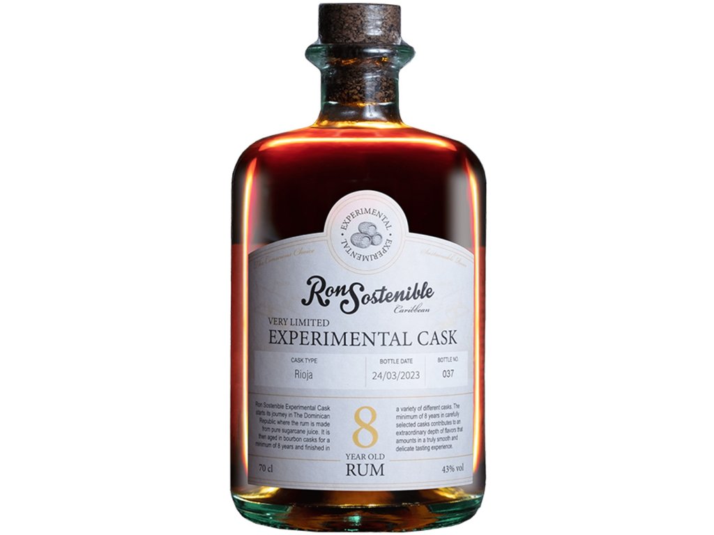 Ron Sostenible - Rioja Cask - Ron Sostenible Experimental Rioja Cask nejprve zraje v sudech po Bourbonu po dobu 8 let na dominikánský republice, poté je dokončen v sudech po Rioja v evropě na 5 měsíců.
