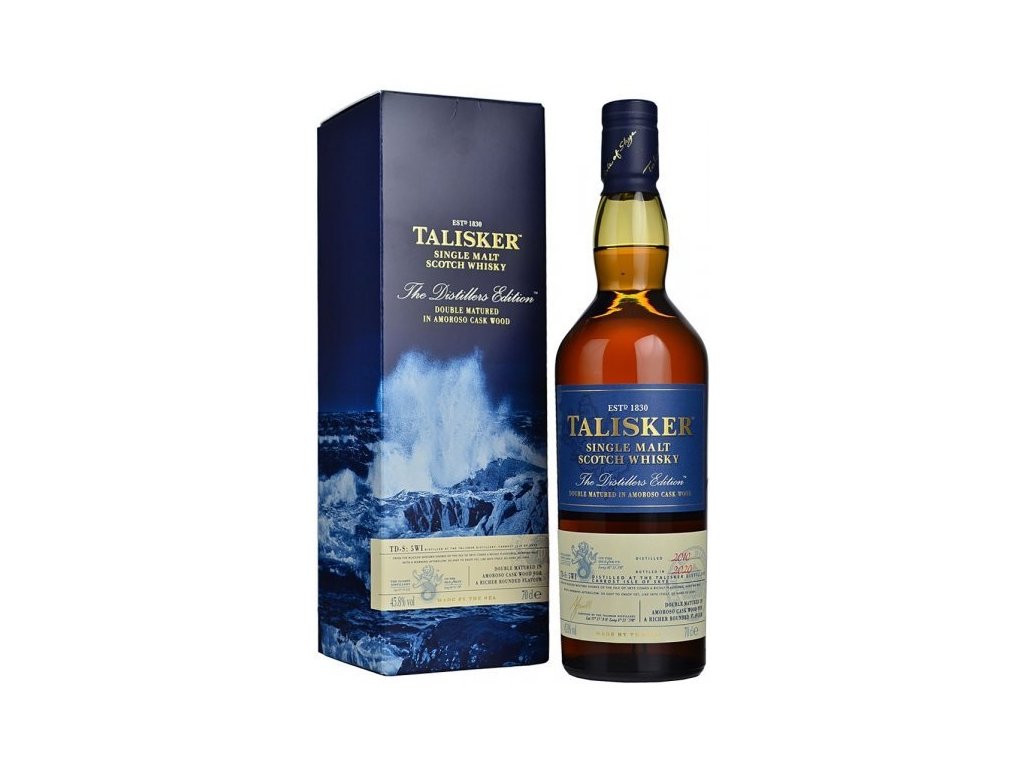 Talisker Distillers Edition ročník 2010. Dvojité dozrávání, s finišem v amoroso sudech (oslazené španělské víno). Výsledkem je sladký a kouřový Talisker.