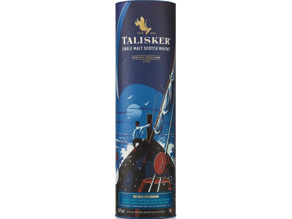 Whisky Talisker The Wild Explorador Special Releases 2023, to je éterická single malt whisky zrozená mořem. Je slaná, bouřlivá, kouřová a stejně živelná jako země či bouře. Uprostřed hluboké zlaté záře cítíte vůni moře a spálené dřevo. Má lehce olejnatou texturu a v chuti je sladká, kořenitě nakouřená, slaná a současně ovocná jako sad. V závěru pak cítíte tóny rašeliny a chilli koření. Náš Master Blender tuto špičkovou námořní whisky dokončuje v kombinaci sudů po červeném, bílém a hnědém portském, čímž jí dává podivuhodnou rovnováhu a vzdává tak hold portugalskému původu velkých námořnických lodí. Prostupují jí také bohaté, sladké tóny bílých hroznů, tmavého ovoce a třísloviny. Tyto znaky se pak v ústech spojí v jednu krémově hladkou, bohatě ovocnou chuť se slaným, kouřovým závěrem.