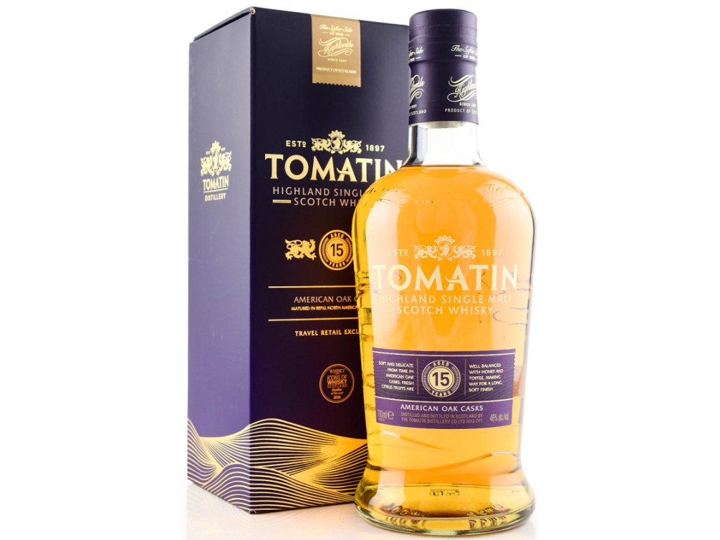 Další na řadě je 15letý Tomatin, zrající v sudech z amerického dubu. Lehký a svěží na nose, okouzlující citrusové plody jsou dobře vyvážené s objevujícími se příchutí medu a karamelu, které po nějakou dobu jemně přetrvávají na patře.