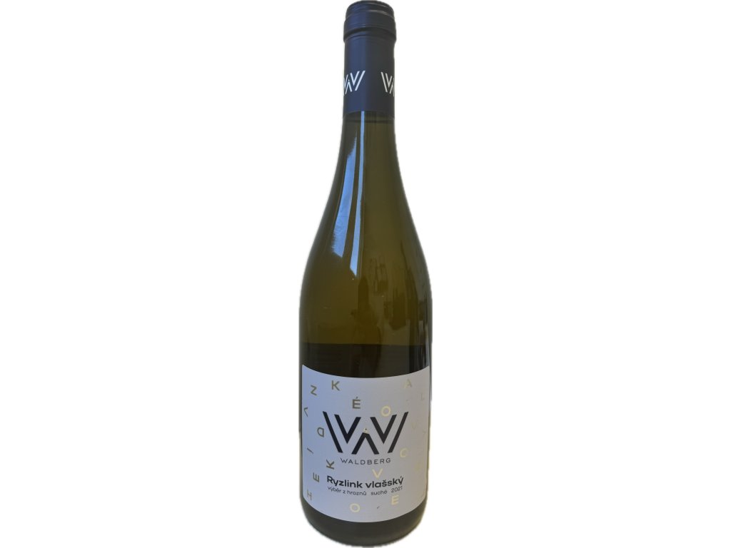 Ryzlink Vlašský - vinařství Waldberg. Suché bílé jakostní odrůdové víno s přívlastkem výběr z hroznů, ročník 2021. Víno zrálo v dubovém sudu.